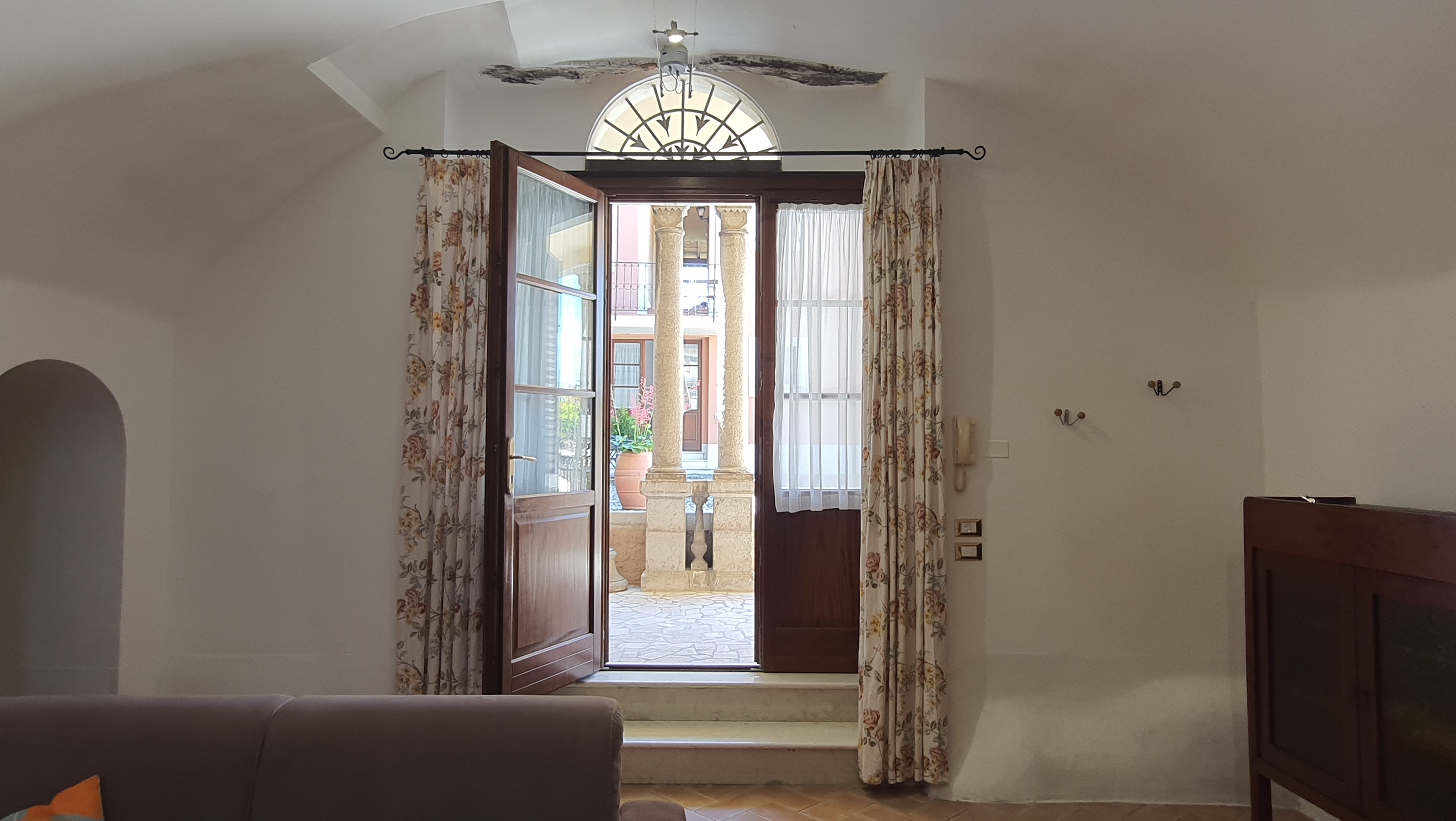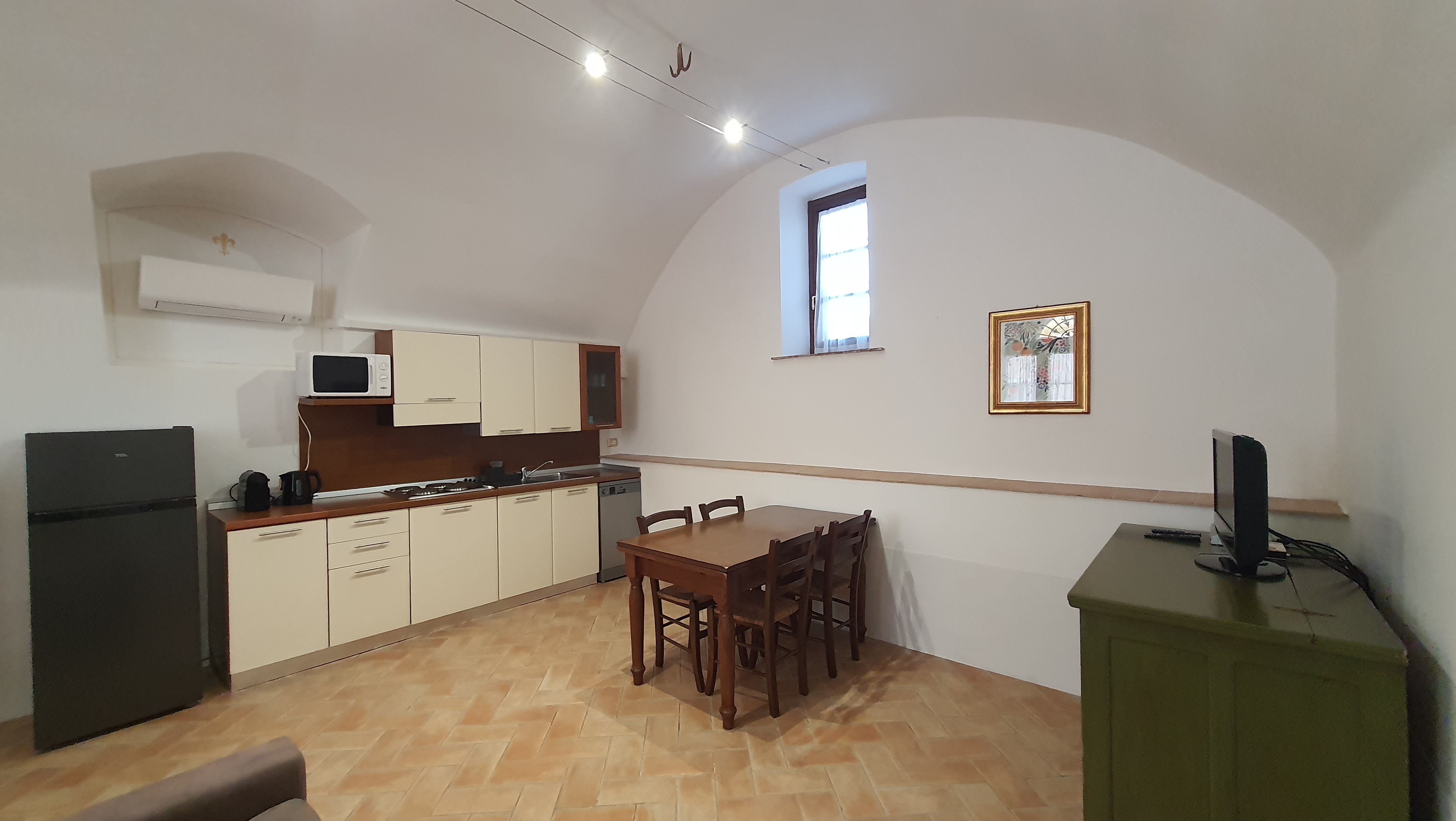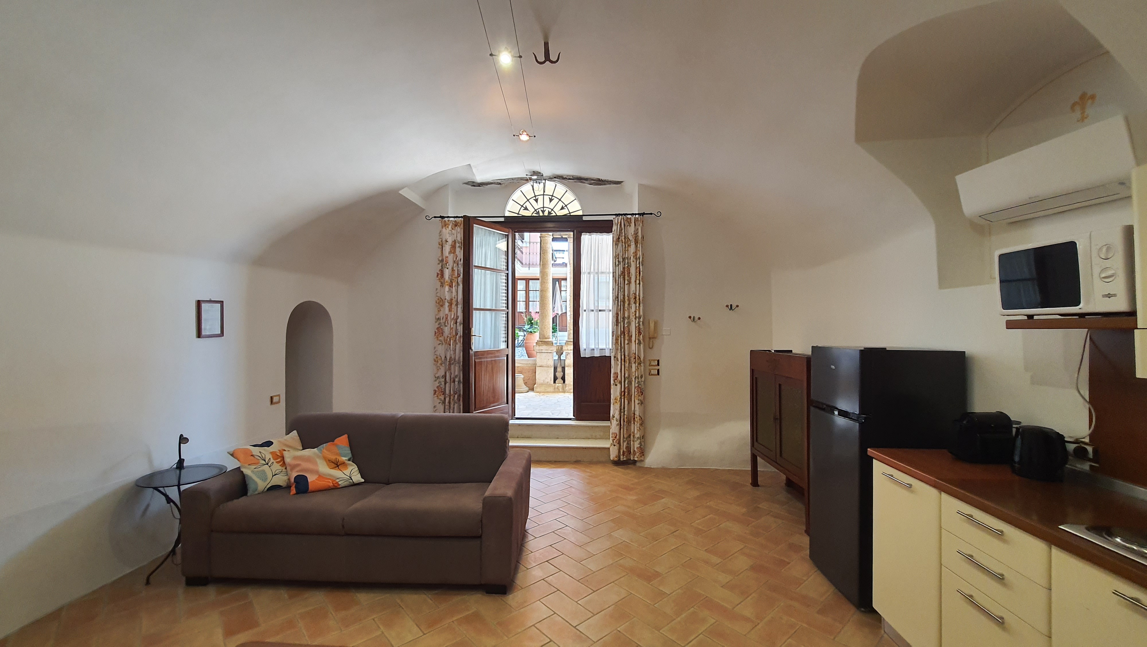 Die Wohnung befindet sich im ersten Stock und hat einen Teil der Terrasse zum Innenhof mit weitem Blick in den Park. Sonnenliegen, Tisch, Stühle und Sonnenschirm sind vorhanden. Es besteht aus einem Wohnzimmer mit ausgestatteter Küche und Doppelbett, großem Badezimmer mit Dusche.
