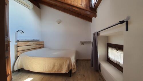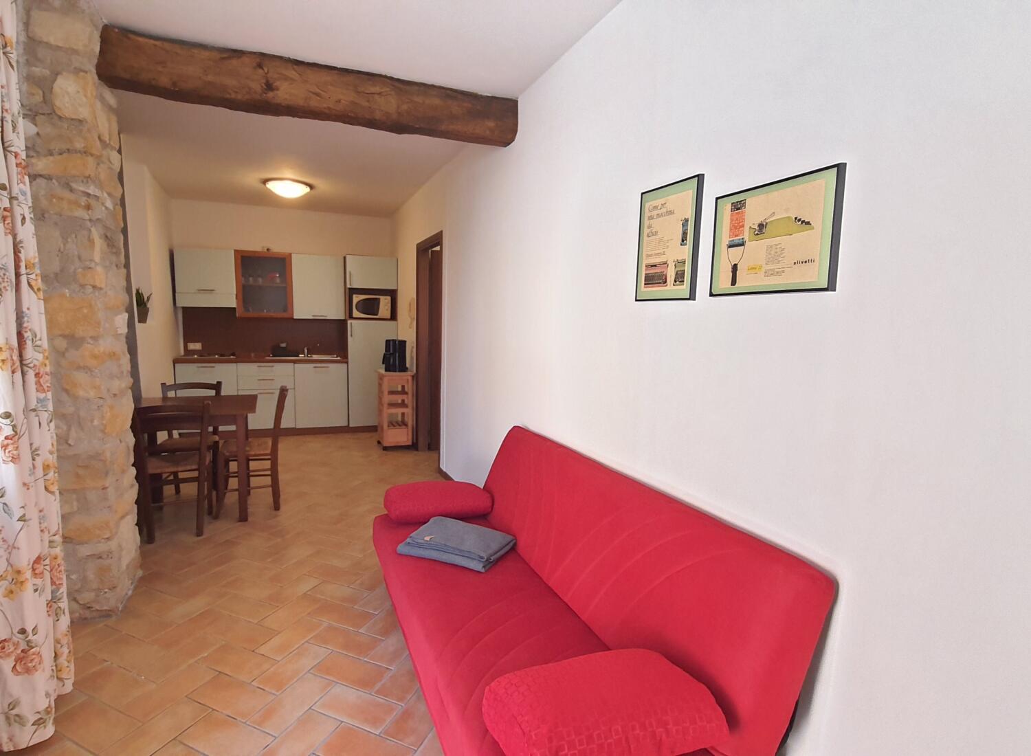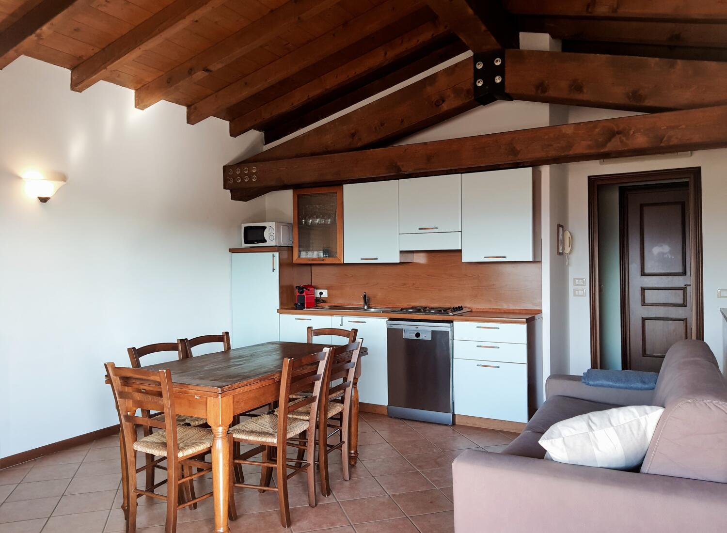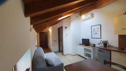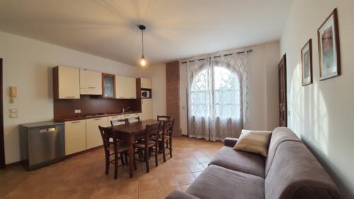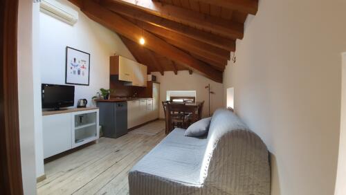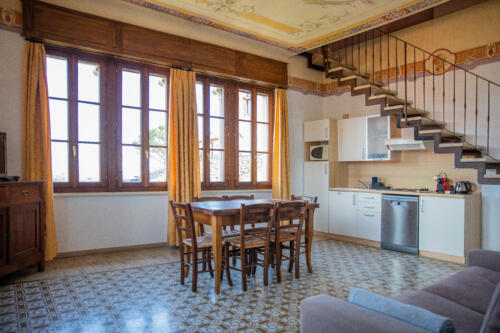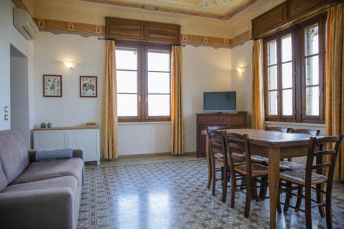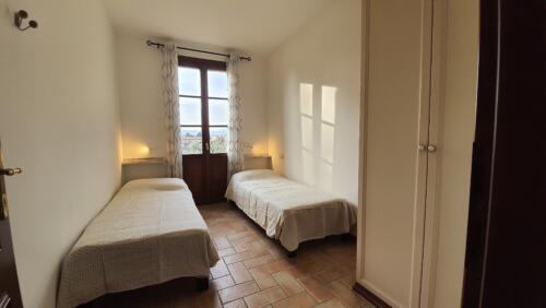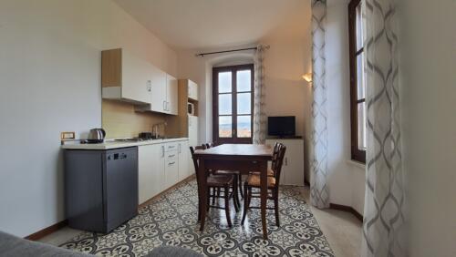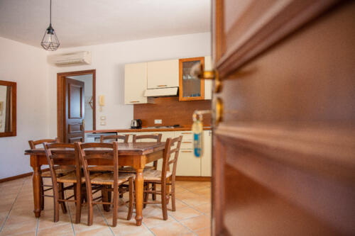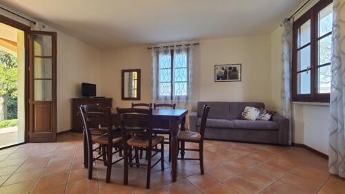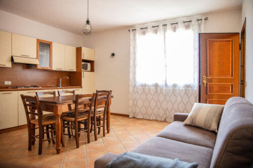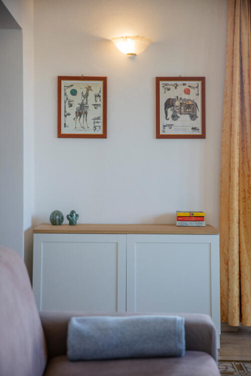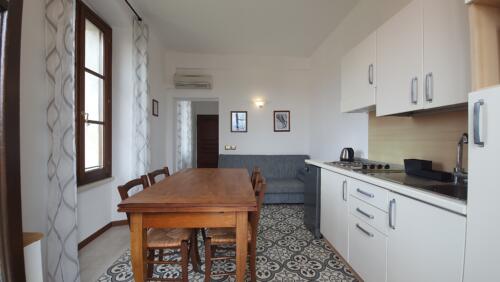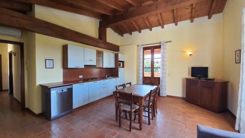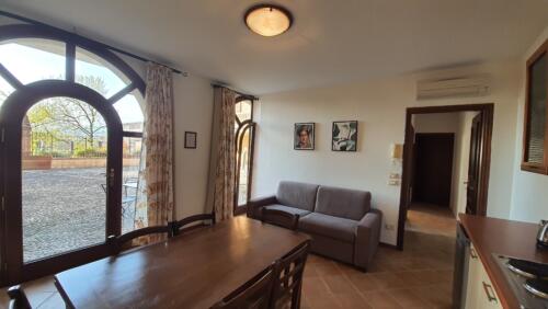 Die Wohnung befindet sich im ersten Stock und hat einen Teil der Terrasse zum Innenhof mit weitem Blick in den Park. Sonnenliegen, Tisch, Stühle und Sonnenschirm sind vorhanden. Es besteht aus einem Wohnzimmer mit ausgestatteter Küche und Doppelbett, großem Badezimmer mit Dusche.